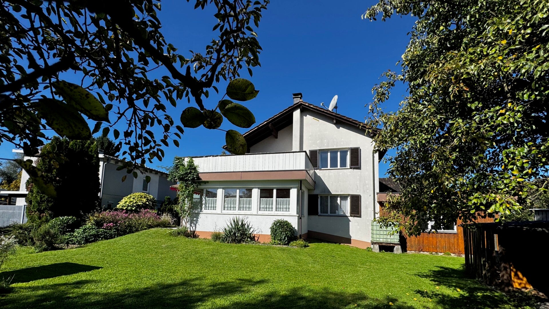 Besonders hervorzuheben ist der 1995 errichtete Wintergarten mit Schwedenofen, elektrischen Jalousien und Sonnenmarkise. Von hier aus gelangt man direkt auf die großzügige Sonnenterrasse und in den weitläufigen Garten mit gemütlicher Weinlaube.